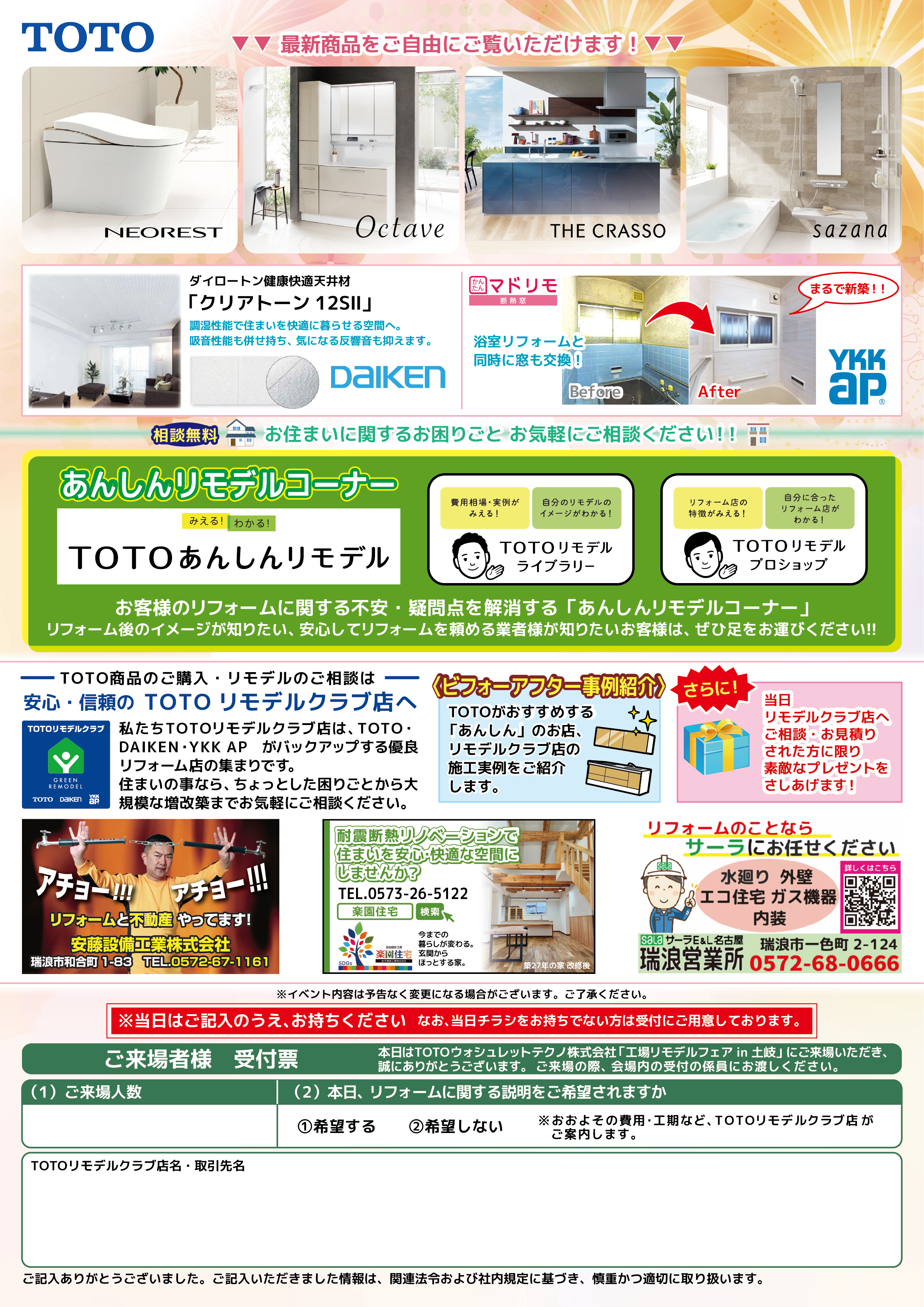 サーラE&L名古屋 瑞浪営業所では『TOTOリモデルフェア』に出展します