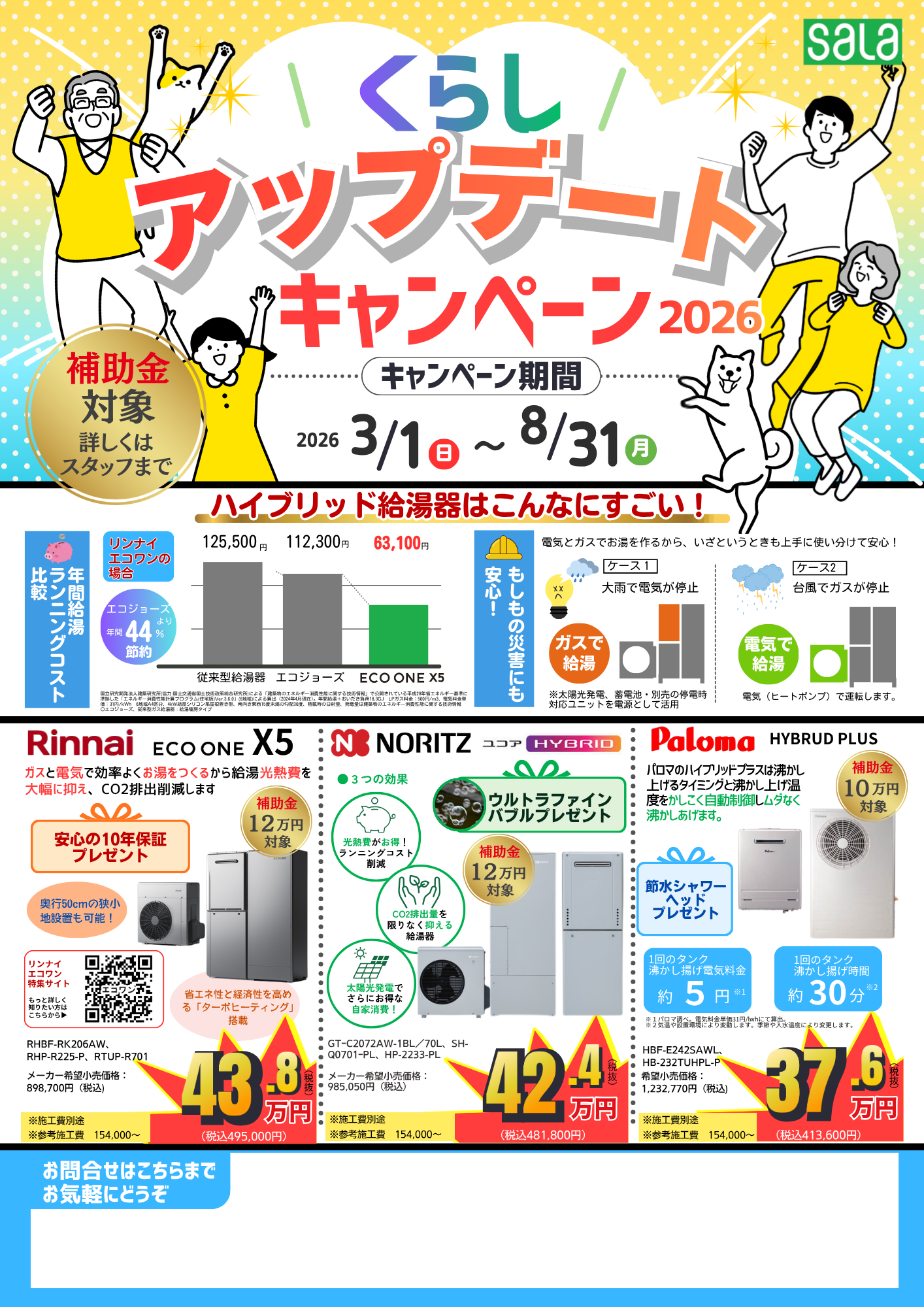 2026年3月1日(日)〜8月31日(月)までの期間限定! 今なら補助金対象モデルも多数ラインナップ。光熱費を賢く抑えて、住まいの機能を最新の状態へアップデートしませんか?